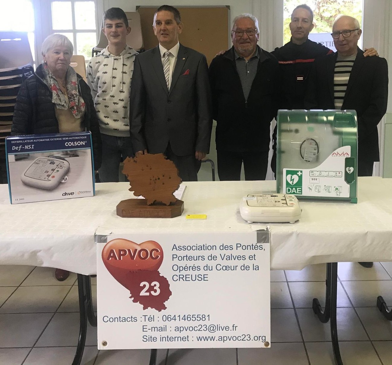 SAINT PARDOUX LE NEUF : petite commune, mais belle assistance pour accueillir ce samedi 5 novembre 2022 Éric SKRABAN, Président de L’APVOC 23, lui même accompagné d’Hélène son épouse et de Corentin son fils ainsi que de Claude et Christiane, respectivement Vice-Président et Commissaire aux comptes de l’association. Cette petite délégation était elle même, comme c’est le cas depuis mai 2018, rejointe sur place par le Lieutenant infirmier Sapeur Pompier Hervé Martin, du Centre de Secours d’AHUN, qui, à chaque sollicitation d’Éric, n’hésite pas à prendre sur son temps pour venir faire une démonstration d’utilisation d’un défibrillateur cardiaque lors de chaque remise. Et c’était encore le cas aujourd’hui.