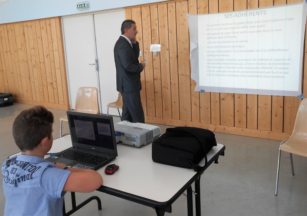 En préambule, Éric présenta l’APVOC 23 au moyen d’un power-point et les personnes présentes purent, à la fin de cette présentation, mieux comprendre pourquoi Éric et l’APVOC 23 s’investissaient dans la remise de défibrillateurs cardiaques.